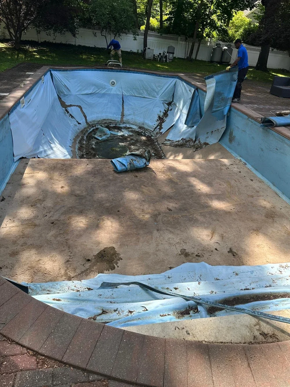 Two workers are repairing or removing a damaged, empty swimming pool by pulling back the pool liner, which is torn and dirty.